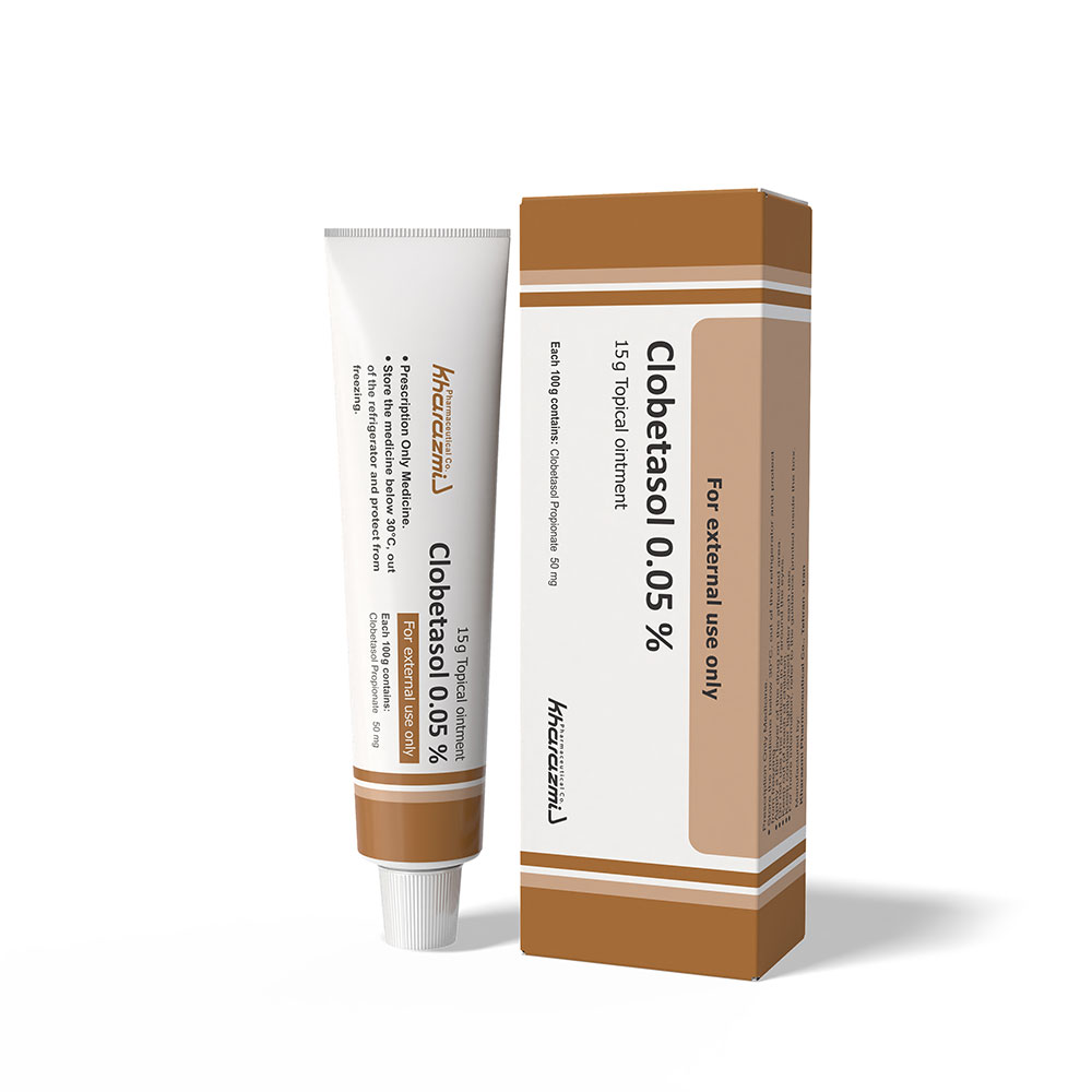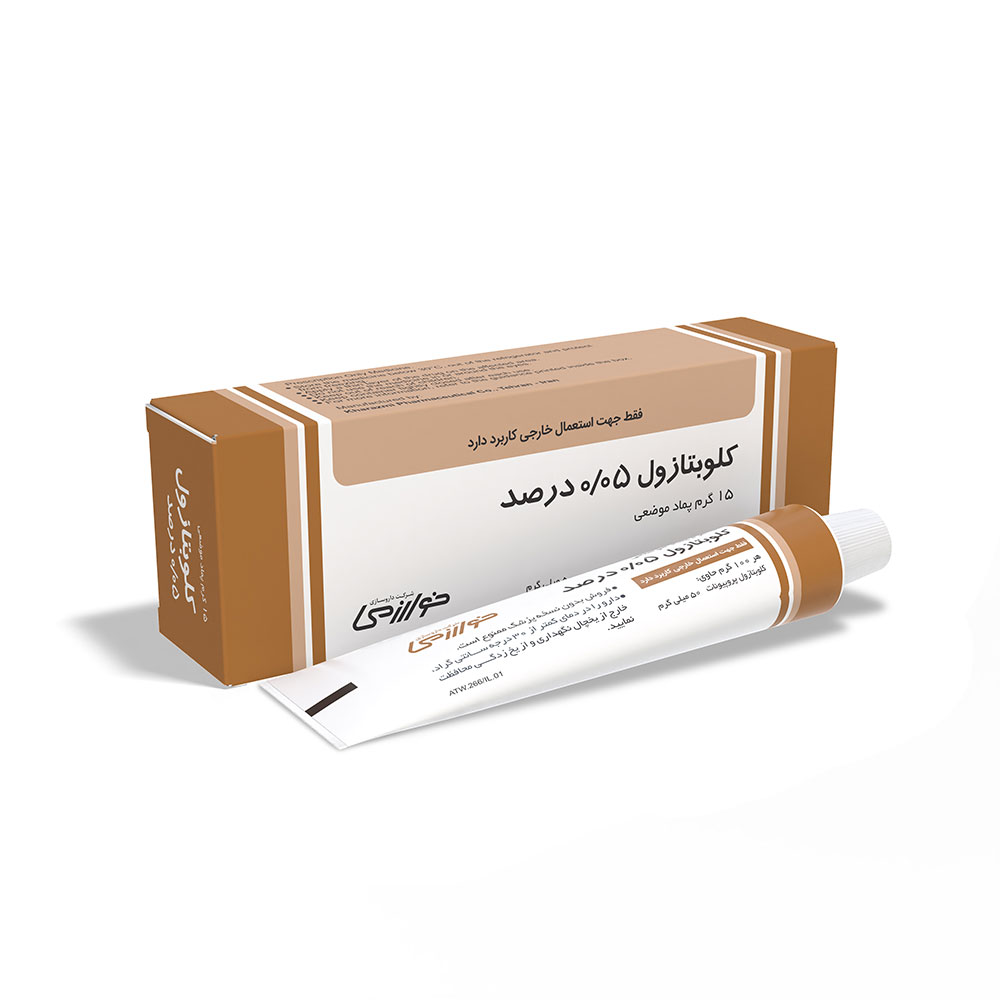 | معرفی محصول | هر پماد 15 گرمي، حاوي 50 ميلي گرم كلوبتازول پروپيونات در هر 100 گرم پماد مي باشد كه به همراه متن راهنماي محصول توسط شرکت داروسازی خوارزمی توليد و به بازار عرضه میشود. | |