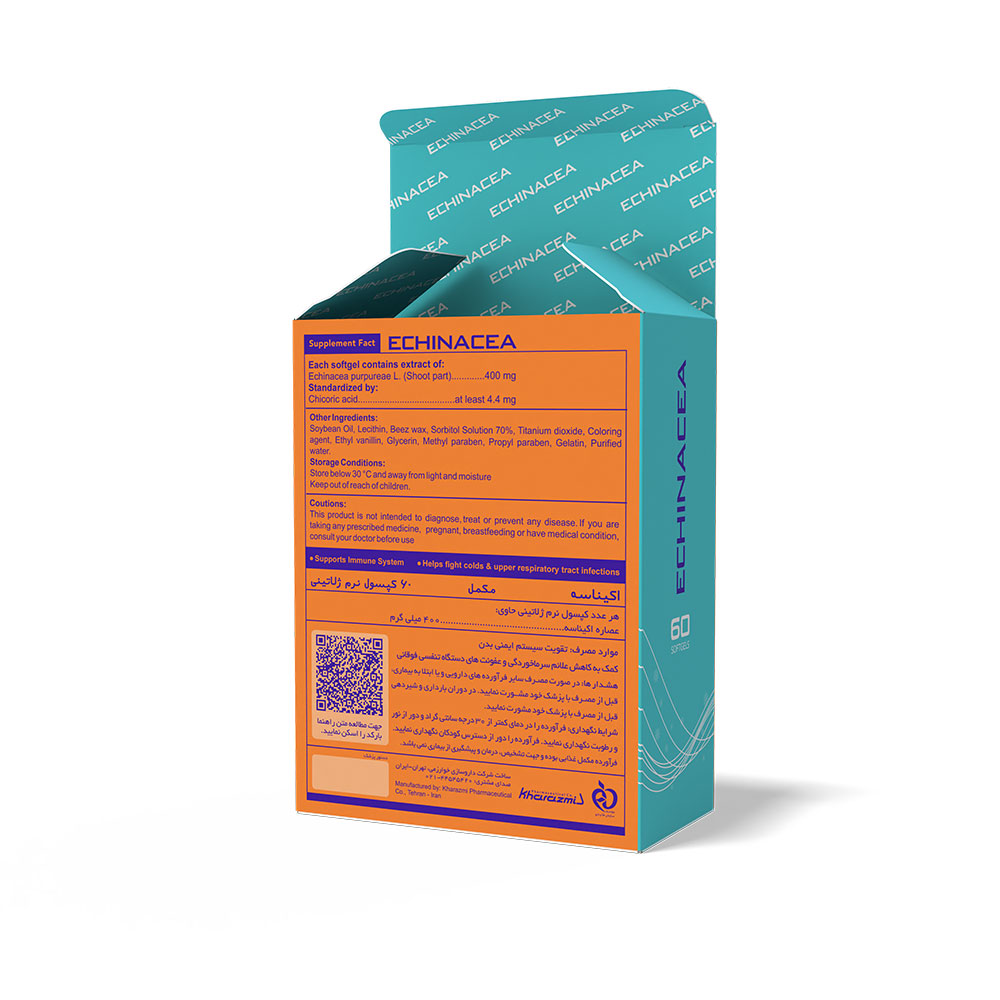 | عوارض جانبی | اکیناسه میتواند باعث واکنشهای آلرژیک در بیماران مستعد آلرژی شود. در صورت بروز علائم آلرژیک شدید مانند واکنش آنافیلاکتیک شامل احساس سرگیجه یا ضعف، مشکلات تنفسی یا خس خس سینه، ضربان قلب سریع، بثورات پوستی و تورم صورت به خصوص زبان و گلو، مصرف محصول را متوقف کرده و فورا به مرکز درمانی مراجعه کنید. | |