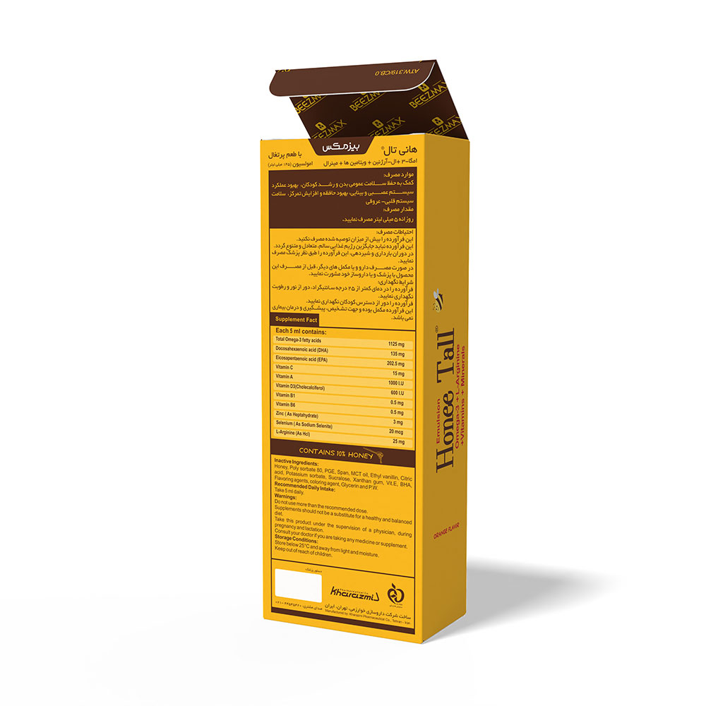 | معرفی محصول | هانی تال امگا-3 +ال-آرژنين + ويتامين ها + مينرال هر5 ميلي ليتر از امولسيون خوراكي حاوي 1125ميلي گرم امگا-3 (135 ميلي گرمDHA و 5/202 ميلي گرم EPA)، 15 ميلي گرم ويتامين C ، 1000 واحد بين المللي ويتامين A، 600 واحد بين المللي ويتامين D3 (كوله كلسيفرول)، 5/0ميلي گرمB1 ، 5/0 ميلي گرم ويتامين B6، 3 ميلي گرم زينك (به صورت ملح سولفات هپتا هيدرات)، 20 ميكروگرم سلنيوم (به صورت سديم سلنيت) و 25 ميلي گرم ال- آرژنين به صورت هيدروكلرايد مي باشد كه توسط شركت داروسازي خوارزمي توليد و به بازار عرضه مي شود. | |