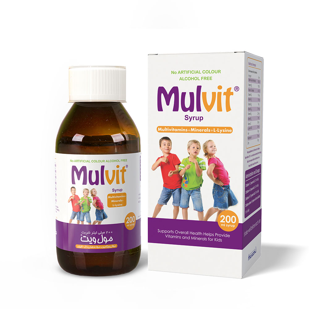 معرفی محصول مولتی ویتامین+ مواد معدنی+ ال-لیزین هر پيمانه (5 ميلي ليتر) از شربت 200 ميلي ليتري مول ويت® حاوی 1500 واحد بين المللي ويتامين A پالميتات، 150 واحد بين المللي ويتامين D3 (كوله كلسيفرول)، 47/4 واحد بين المللي ويتامين E استات، 5/1 ميلي گرم ويتامين B1 (تيامين)، 5/1 ميلي گرم ويتامين B2 (ريبوفلاوين)، 1 ميلي گرم ويتامين B6 (پيريدوكسين)، 5 ميلي گرم ويتامين B3 (نياسين آميد)، 5/1 ميكروگرم ويتامين B12 (سيانوكوبالامين)، 5/2 ميلي گرم ويتامين B5 (دكسپانتنول)،30 ميلي گرم ويتامين C (آسكوربيك اسيد)، 40 ميلي گرم ال-ليزين هيدروكلرايد، 5 ميلي گرم آهن (به صورت گلوكونات دي هيدرات)، 10 ميلي گرم منيزيم (به صورت گلوكونات)، 5 ميلي گرم زينك (به صورت گلوكونات)  مي باشد که در جعبه هاي يك عددی همراه با پيمانه و برگه راهنمای مصرف فرآورده عرضه می شود.