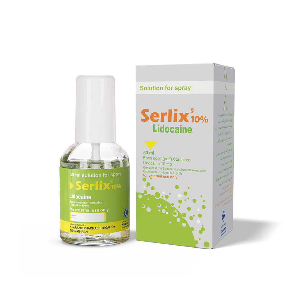 | معرفی محصول | اسپري سرليكس 10 درصد با حجم 50 ميلي ليتر حاوي 10 ميلي گرم ليدوكائين در هر 1 دوز (پاف) مي باشد . لیدوکائین یک نوع بی حس کننده است که اسپری آن با هدف بهبود دندان درد، رفلكس حلقي جهت معاينات دندانپزشكي، اعمال جراحي دهان، تسکین درد زخمهای موضعی و براي مهار اندوسكوپي يا لوله گذاري در ناي به کار میرود. | |