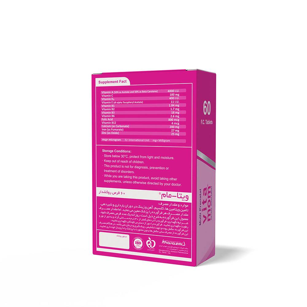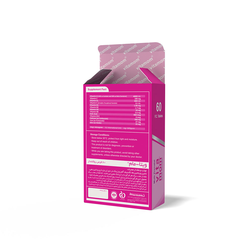 مصرف مولتی ویتامین ویتامام® خوارزمی در مادران باردار و شیرده با حفظ سلامت سیستم قلبی عروقی، افزایش سطح انرژی، حفظ سطح طبیعی فشار خون ارتباط دارد. همچنین در نوزادان به حفظ سلامت چشم و سیستم بینایی، رشد و نمو، حفظ سلامت عمومی، شکل گیری صحیح قلب و مغز و همچنین پیشگیری از بسیاری از بیماری ها کمک می کند. این مولتی ویتامین یکی از مکمل های طراحی شده برای دوران شیردهی و بارداری است که علاوه بر ویتامین های محلول در آب و چربی حاوی آهن، روی و کلسیم است که از مهم ترین مینرال های مورد نیاز در این دوران هستند ويتامين A : رتينول در بينايي، رشد، تمايز بافت اپيتليال و نيز نگهداري غشاهاي مخاطي چشم، پوست، دهان، دستگاه گوارش و دستگاه ادراري ضروري است. ويتامين D3: كوله كلسيفرول در كنترل جذب كلسيم رژيم غذايي از روده و بازجذب كلسيم از كليه ضروري است. ويتامين E: توكوفرول يك ويتامين محلول در چربي است كه داراي خواص آنتي اكسيداني است. ويتامين E، اجزا تشكيل دهنده سلول را از اكسيداسيون محافظت كرده و از تشكيل محصولات اكسيداسيوني سمي جلوگيري مي كند. كمك به حفظ پيوستگي ديواره گلبول هاي قرمز مي كند و گلبول هاي قرمز را از هموليز حفظ كرده و از تجمع پلاكت ها جلوگيري مي كند. ويتامين C : آسكوربيك اسيد يك ويتامين محلول در آب با خواص آنتي اكسيداني است كه به عنوان يك كوآنزيم ضروري براي تشكيل كلاژن، ترميم بافت، سنتز ليپيد و پروتئين است و به عنوان يك آنتي اكسيدان براي بسياري از فعاليت هاي فيزيولوژيكي (متابوليسم آهن و فوليك اسيد، افزايش مقاومت به عفونت و حفظ يكپارچگي ديواره عروق) ضروري است. ويتامين B1 : تيامين يك ويتامين محلول در آب است كه اثرات اوليه آن شامل: متابوليسم كربوهيدرات ها، حفظ رشد طبيعي، انتقال تكانه هاي عصبي و سنتز استيل كولين است. تيامين براي متابوليسم هوازي طبيعي ضروري است. ويتامين B2: ريبوفلاوين يك ويتامين محلول در آب با اثرات آنتي اكسيداني است. ويتامين B6: پيريدوكسين يك ويتامين محلول در آب است كه به عنوان يك كوآنزيم براي متابوليسم آمينواسيد، گليكوژن، كربوهيدرات، چربي و پروتئين ها است. پيريدوكسين  به سنتز هموگلوبين و افـزايش مقـدار اكسيژن حمـل شده توسـط هموگلوبيـن كمك مي كند. پيريدوكسين با تبديل كربوهيدرات و ساير قندها به گلوكز به نرمال نگه داشتن سطح گلوكز خون كمك مي كند. پيريدوكسين همچنين كمك به تقويت سيستم ايمني، سيستم عصبي و بهبود خلق و خوي مي كند. ويتامين B3 : نياسين آميد داراي اثرات آنتي اكسيدان و ضد التهاب مي باشد كه به عنوان جزئي از كوآنزيم در ليز گليكوژن، متابوليسم چربي و تنفس سلولي مشاركت مي كند. ويتامين B12: سيانوكوبالامين كمك به رشد و توليد سلول ها، سنتز گلبول هاي قرمز و سنتز ميلين (سلول هاي حفاظتي از نورون) مي كند. آهن: آهن بخشي از تركيب هموگلوبين، ميوگلوبين و تعدادي از آنزيم هاست كه در انتقال اكسيژن نقش دارند. كمبود آهن مي تواند روي متابوليسم ماهيچه ها و توليد گرما و نيز بر روي رفتار و يادگيري كودكان اثر بگذارد. زينك (روي): رشد طبيعي و ترميم بافت به مقدار كافي زينك بستگي دارد. زينك به عنوان بخشي از چندين آنزيمي است كه در متابوليسم كربوهيدرات و پروتئين نقش دارند. محل اصلي ذخيره زينك در بافت استخواني و ماهيچه اي است، همچنين در مو، ناخن، پروستات و قرنيه نيز ذخيره مي شود. فوليك اسيد: فوليك اسيد در سنتز گلبول هاي قرمز و نوكلئيك اسيدها نقش دارد. همچنين باعث كاهش ريسك تولد نوزادان با نواقص مغزي و نخاعي مانند ستون فقرات شكاف دار مي شود. كلسيم: به عنوان يك مكمل غذايي، براي پيشگيري يا درمان كمبود كلسيم در بدن مصرف مي شود. كه به پيشگيري يا جلوگيري از كاهش توده استخواني (پوكي استخوان) كمك مي كند. كلسيم جزء جدايي ناپذير بافت استخواني است. همچنين سبب كمك به بهبود عملكرد نورون ها، كلسيم ماهيچه ها و عملكرد طبيعي قلب مي شود.