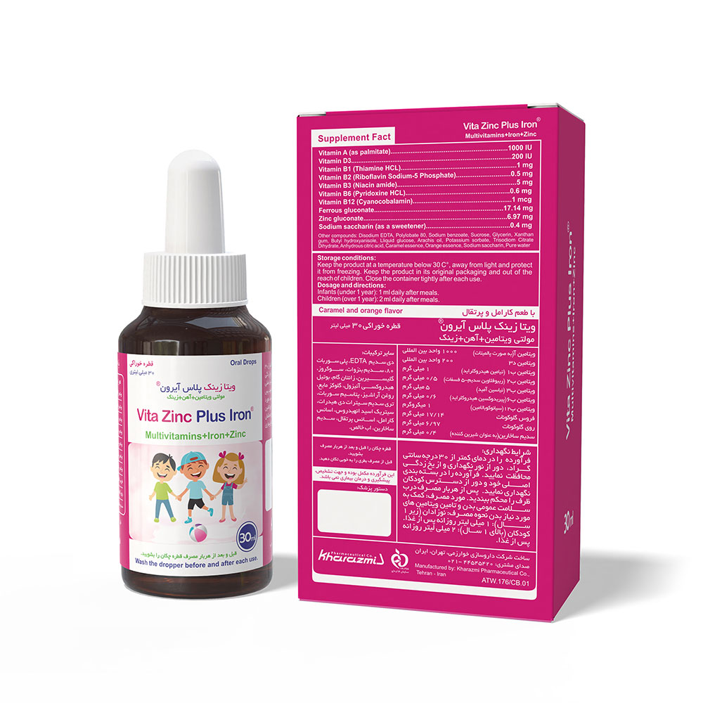 قطره خوراكي مولتي ويتامين+آهن+زينك توسط شركت داروسازي خوارزمي توليد و به همراه متن راهنماي محصول به بازار عرضه مي شود.
